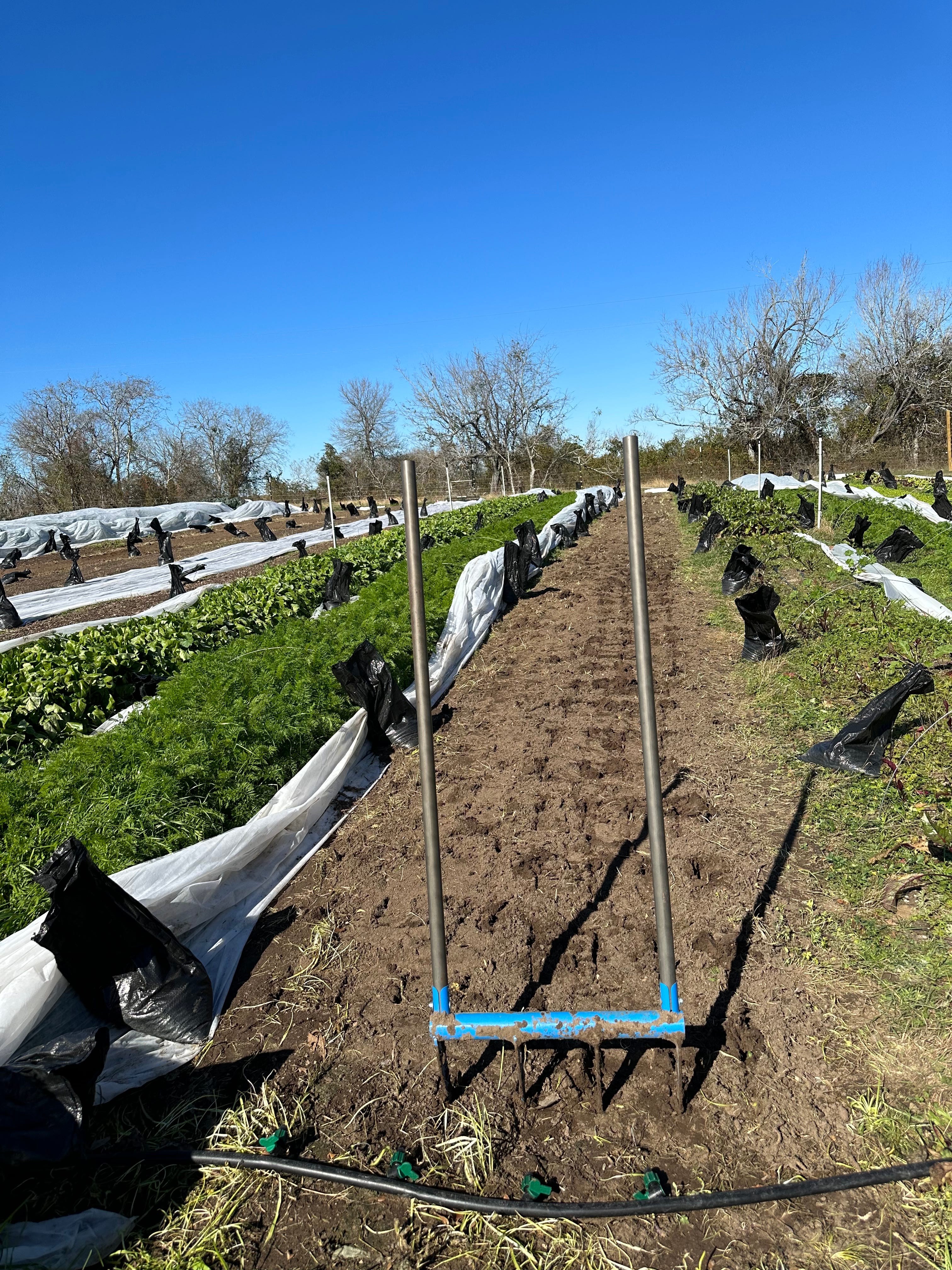 …Once you’ve spread compost and amendments, it's time to rake the bed until it's all spread evenly. I’ll run the irrigation lines back over the bed. Retrieve the transplants from the propagation house and bring them to the head of the bed. I always like to give them a good microbial root soak of either a compost tea or extract to give them a good boost of biology right at the root zone before planting…